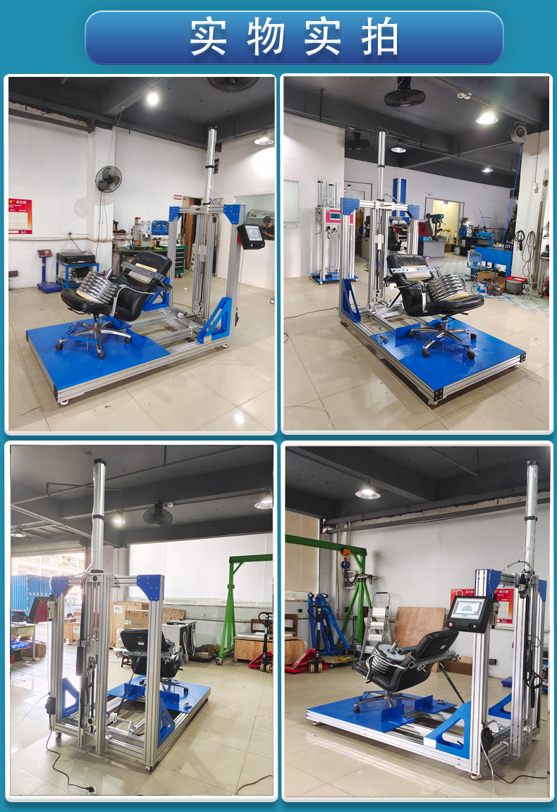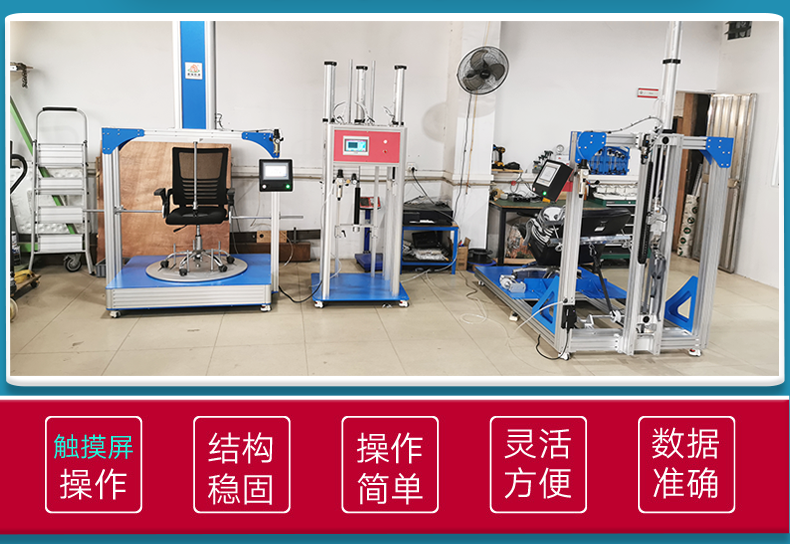 本試驗(yàn)機(jī)用于辦公桌耐久性、椅子背架耐久性、傾斜機(jī)械裝置的測(cè)試,并可對(duì)辦公桌、椅子靜壓強(qiáng)度進(jìn)行測(cè)試。固定辦公椅/桌的腳輪,對(duì)辦公桌、椅子靠背/座面一定的力量、速度及規(guī)定測(cè)試作靠背動(dòng)作,以評(píng)估產(chǎn)品之質(zhì)量。